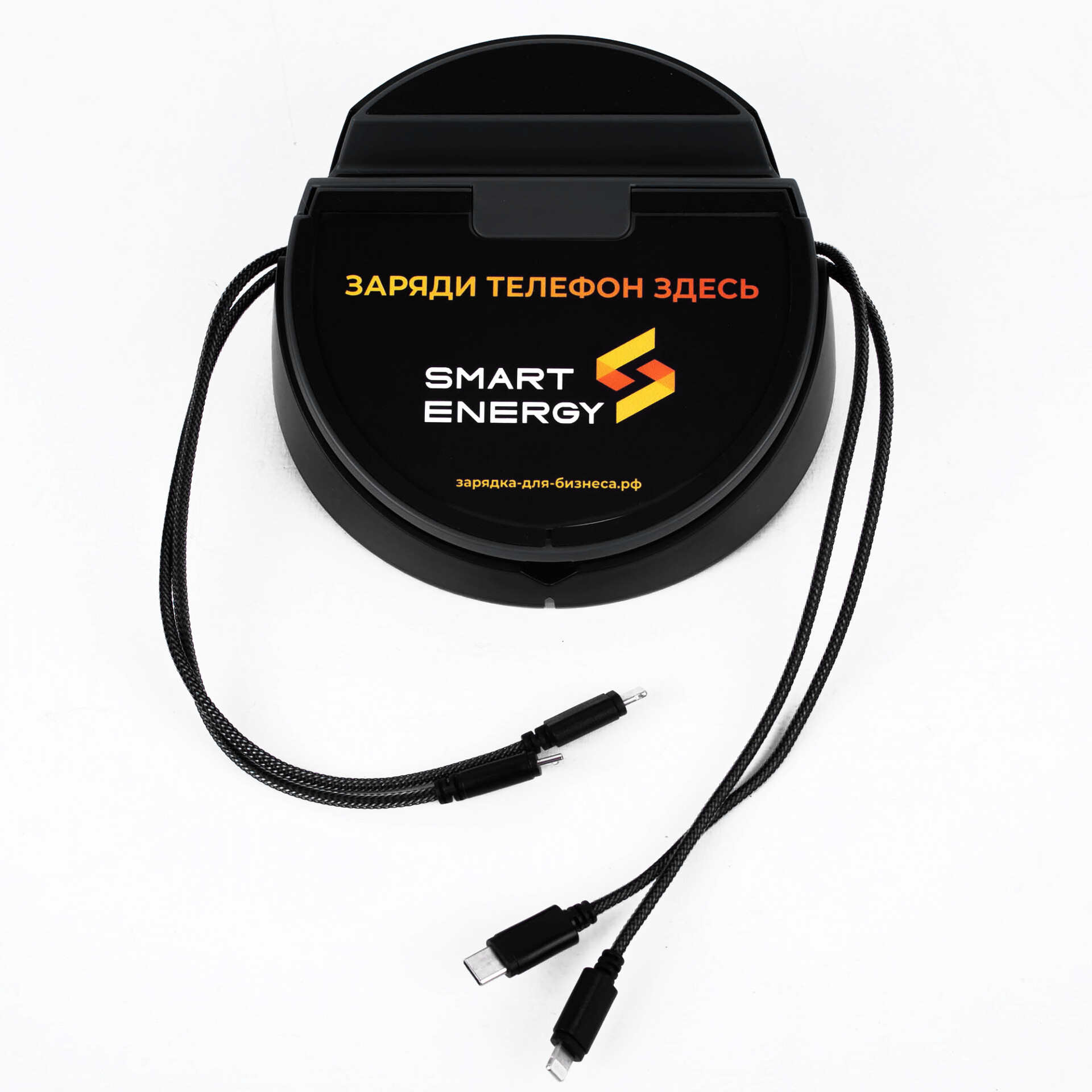Зарядная стойка на 6 устройств (3 кабеля и 3 qi модуля, либо 6 кабелей). 2 сторонняя LED панель формата А2 для размещения вашей рекламы